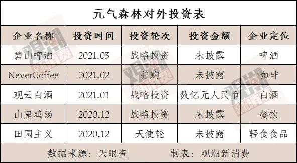 2020年12月,元气森林入股山鬼鸡汤、田园主义两家公司,分别持股80%、20%;截止到目前,元气森林2021年投资碧山啤酒、观云白酒、NeverCoffee三家公司,分别持股25%、25.8%、51%。