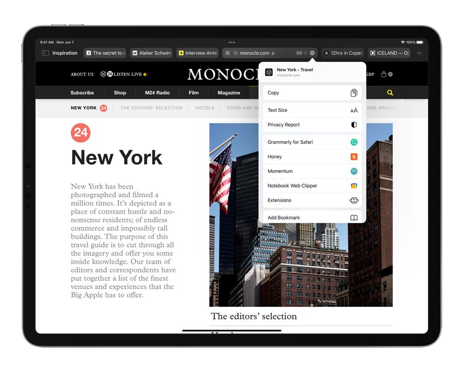 iPhone和iPad上浏览器的多标签管理也得到了基于同一理念的更新,而且也开始支持拓展插件,这意味着用户可以更加灵活地自定义浏览器功能。M1芯片改变了Mac,然而macOS 12仍支持英特尔x86处理器的Mac,包括2013年下半年的MacBook Pro。