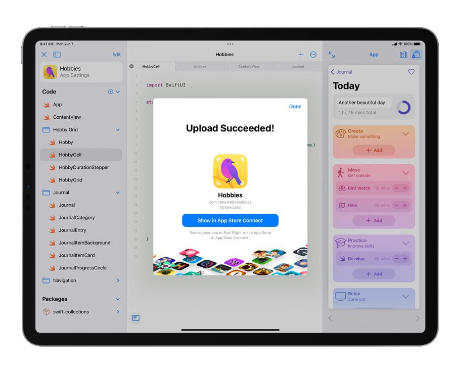 还有谁记得“生产力”吗?iPadOS端的Swift Playground应用有了一次史诗级进步:除了可以像往常一样编写程序,用户可以直接在iPad上编译Swift UI编写的应用,文档、资料库等完整开发资源都可以调用。