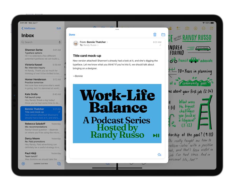 接着,iPadOS有了更强的多任务,可以像Windows 8平板模式那样平行打开两个应用,数据可以互相拖拽互通,并且邮件等应用打开次级窗口时,会以不影响当前多任务的浮窗形式出现。多任务管理界面中,可以直接将两个窗口合并为一个任务,切换后就是平行打开的形式。