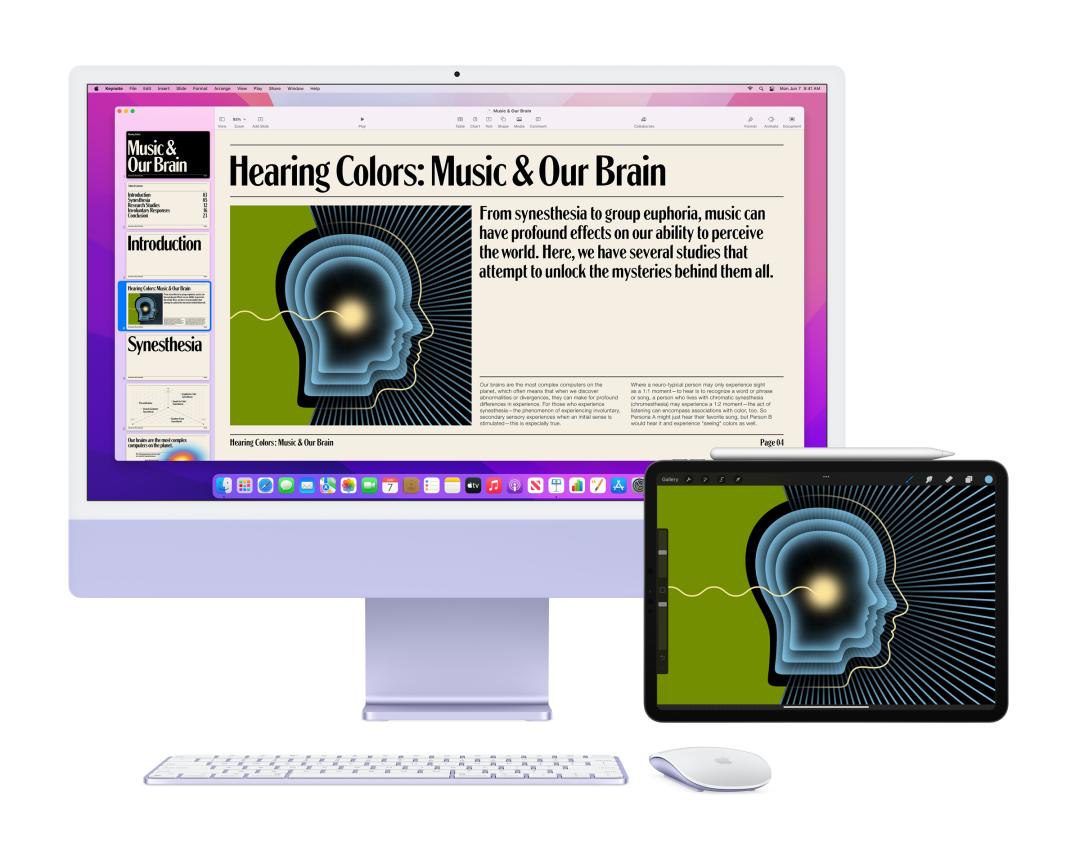 当然也有Mac自己的独门绝技,苹果将其统称为连续互通,现在主打的是Universal Control:只用一套键鼠就能在Mac和iPad上协同工作,将iPad靠近MacBook就能自动识别,可以将光标从macOS移至iPadOS并用笔记本的键鼠控制平板,平板上的文件也能直接跨设备拖拽至笔记本。这一点在不同的Mac设备之间,如iMac和MacBook也是完全一样。