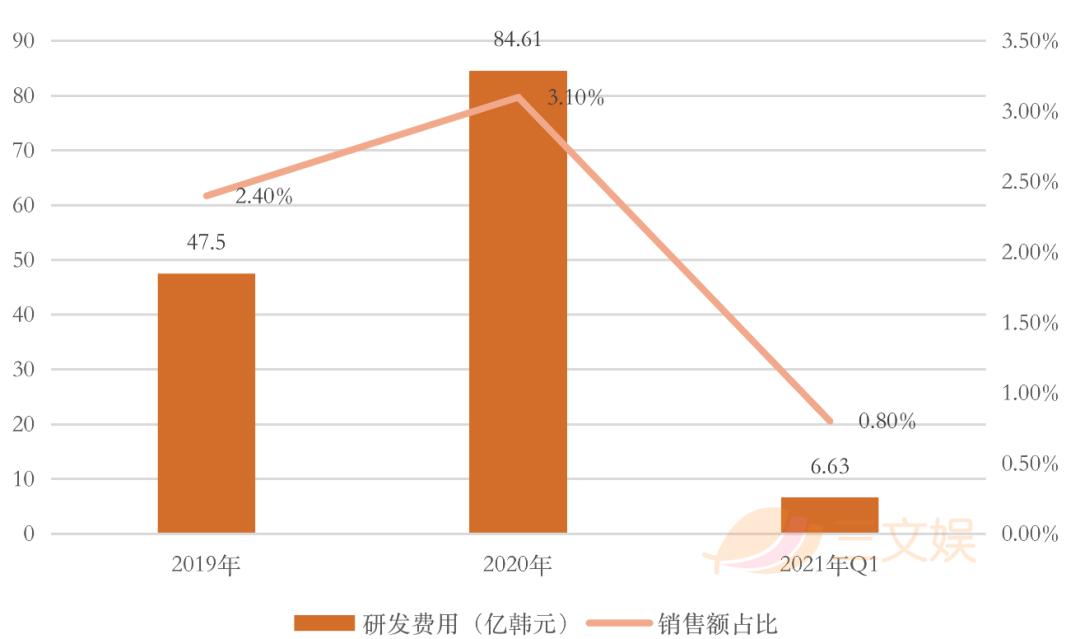 Deawon Media为了稳固其在国内的内容企业的地位,预防韩、日关系会随时恶化而影响公司收益,研发自主的IP品牌就显得尤为重要和迫切。为此,第一季度投入到研发的费用为380.2万元,占据销售总额的0.8%。与玩具大厂Aurora World和Sonokong相比,规模就显得较少一些。但2019、2020年的第一季度投入研发的费用皆为0元,与自身相比相对有所增长。