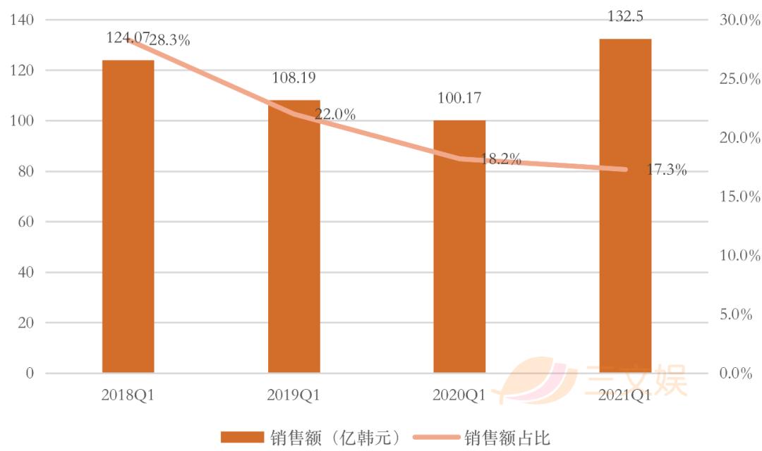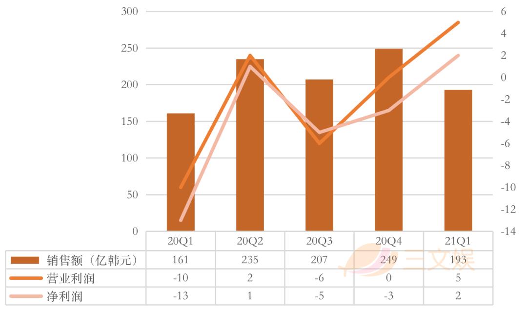 以海外市场为主营市场的Aurora World,新一季度的营收受到美国疫情缓和的影响,呈现出复苏的迹象。第一季度的销售额为359亿韩元(2亿元),同比增长1.8%。营业利润为49亿韩元(2810万元),同比增长11.3%。