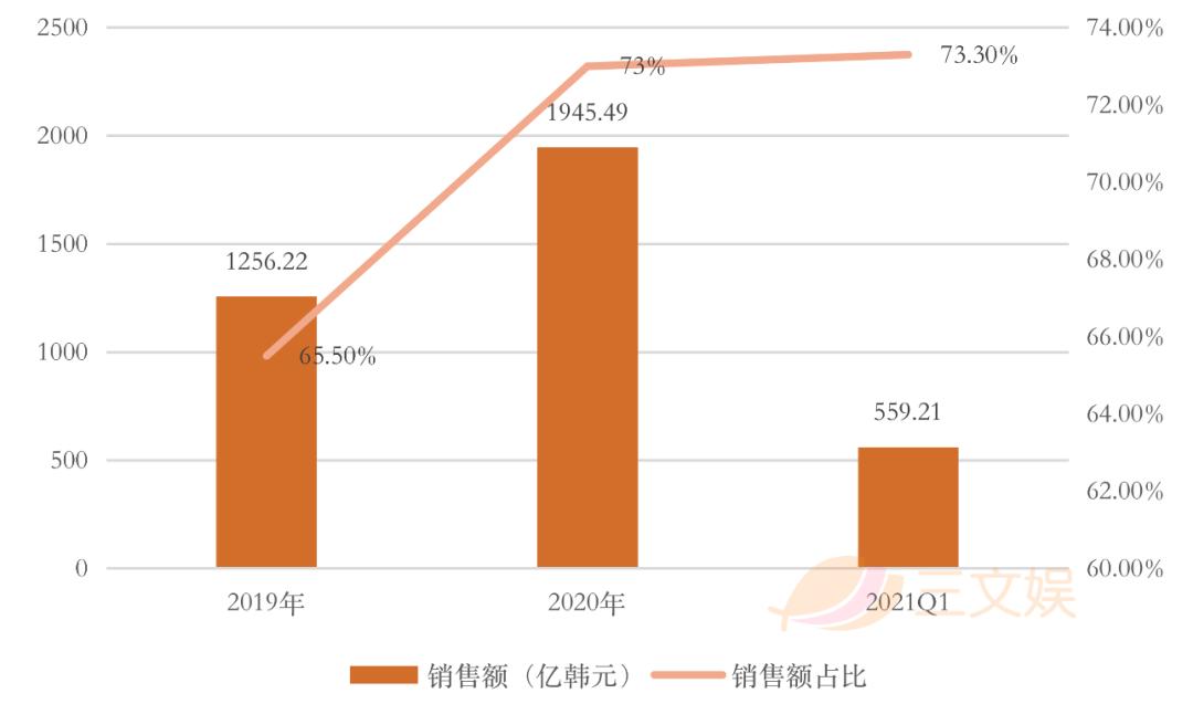 在Deawon Media高举“去日本化”的战略方针,着力开发自主品牌后的这几年,现实却没能如愿发展。依赖任天堂游戏包、游戏设备和日本动画IP生产的角色周边产品的销售额占比持续增高,2019年~2021Q1的占比分别为65.5%、73%、73.3%。