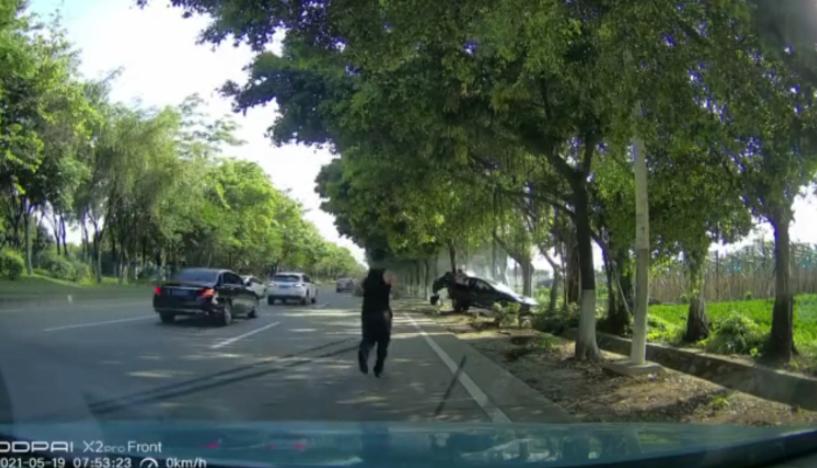 再以5月19日一位特斯拉车主驾驶特斯拉在广州发生的交通事故为例,有一位热心“路人甲”,用行车记录仪拍摄到了一台特斯拉Model 3车型从他旁边飞奔而过,并且不久之后就撞在了一棵树上。