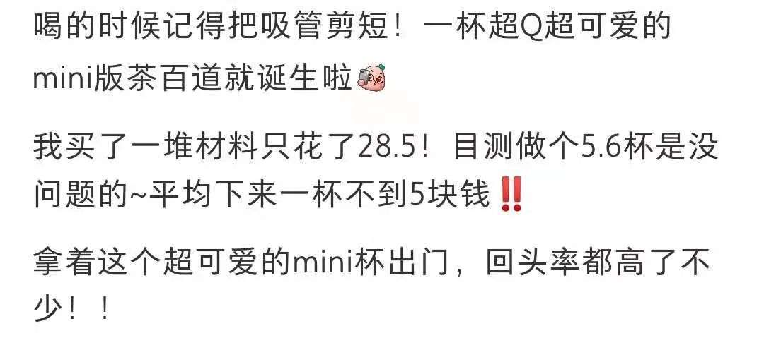 比如在B站,有人购买一杯十几元的常规饮品,搭配3款小料,做出3个mini杯,加上原有饮品,花了20多元,创造出4杯饮品的快乐,还吃出豪华套餐的感觉。