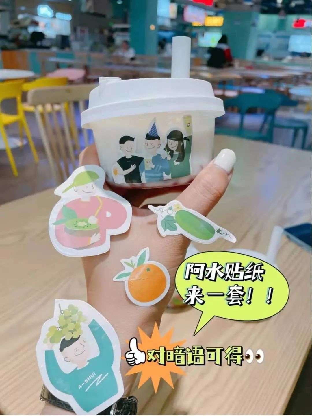阿水大杯茶的做法是购买奶茶点小料就送mini杯,对暗号“阿水大杯 快乐加倍”还能获得贴纸一套。