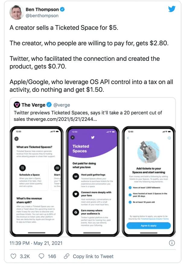 不过,值得承认的是,那类从来没有起势过的业务。比方说,在疫情期间,苹果一开始曾试图对咨询师和培训师等面对面的业务进行抽佣;该公司确实改变了规则,允许通过替代的支付方式来支付一对一的互动费用,但仍然要求对想课程这样一对多的产品进行抽佣。这对新兴的创作者经济也有影响;我在周末曾发过一篇推文:
