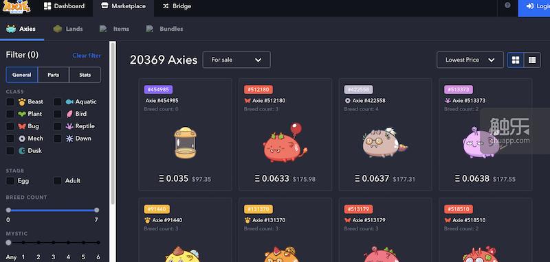 道具都能交易了,作为游戏主体的“阿蟹”自然逃不了被交易的命运。无论亲代还是培育出来的子代,它们最终的命运都是被卖掉,个体好的卖个高价,个体差的卖个低价。游戏官网上有详细的、类似“拍卖行”的交易系统,不光成年“阿蟹”,连未孵化的蛋都可以买卖。出售信息上会有“生命值”“速度”“属性”等个体数值,还会展示这只“阿蟹”的父母和子女,以及曾经的销售记录——在这里,买卖就是一切,这是《Axie Infinity》最主要的运作方式。