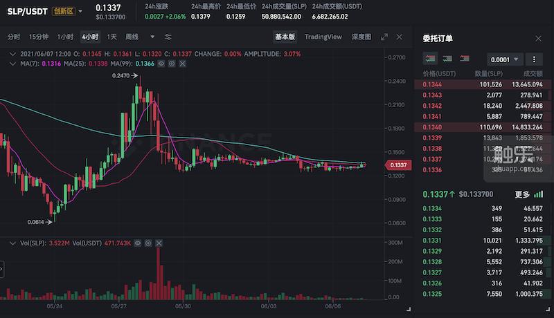 某虚拟货币交易平台上,“SLP”兑USDT的最近价格走势——USDT是个美元代币,把它看成美元就行了