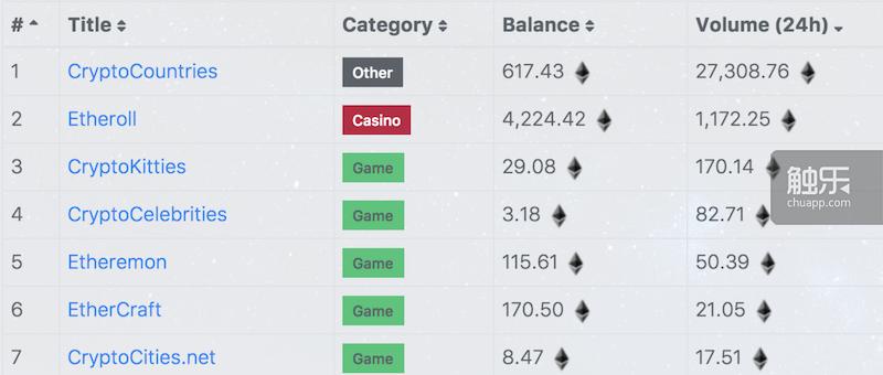 当时的ETH应用排行,第一名就是《加密国家》,只不过没有被算到“游戏”分类里