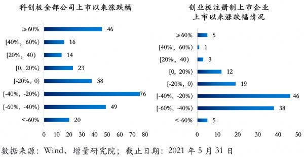 注册制打开上市“开口”后,上市企业资源将不再稀缺,在核准制下的一二级市场估值价差也将不复存在。未来将不会再出现,不论什么公司一旦上市就好几个涨停板的现象,企业上市前后的估值也将趋于“平稳”,只有真正具备持续成长能力的企业,市值才能持续提升。而缺乏核心价值,此前融资估值过高的企业,上市首日便可能出现破发。截至2021年5月底,科创板已有64.89%的企业跌破上市首日收盘价,跌破发行价的有19家;而创业板以注册制上市的公司中,有83.72%的企业跌破首日收盘价,跌破发行价的有7家。