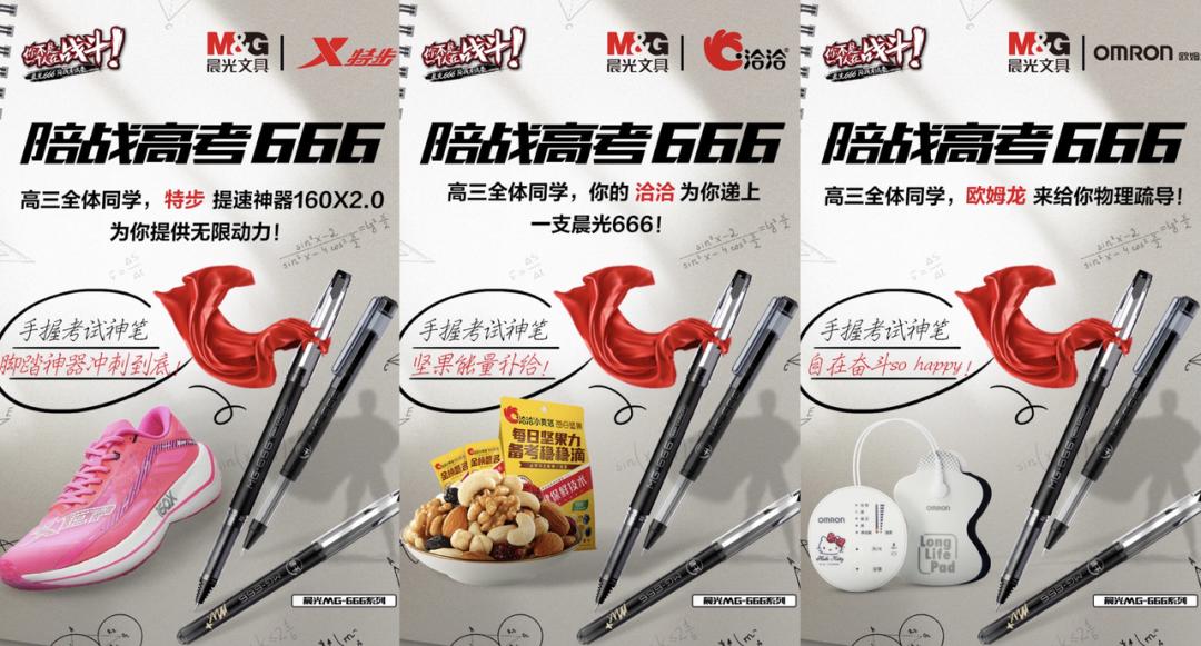 据统计,汉堡王、洽洽食品、养乐多、特步体育、锦江酒店中国等多个品牌,均同晨光文具推出联名海报,并配上了“陪战高考666”的文案。