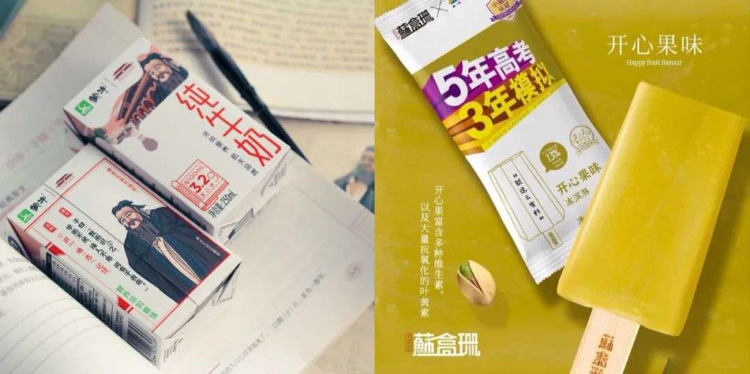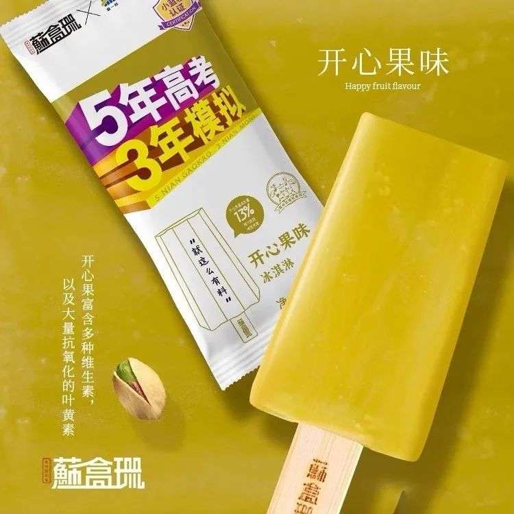 合作学生品牌的还有雪糕品牌苏盒珊。今年4月,苏盒珊同教辅品牌五年高考三年模拟合作推出了联名雪糕。此款产品配色几乎和教辅材料别无二致,包含青柠、葡萄、开心果味三种。据悉商家为了鼓励广大考生,后续将考虑推出购买雪糕积分兑换五三真题,或买五三真题积分抵换雪糕等活动。尽管苏盒珊的玩法确实有趣,但不少网友却高呼“有了心理阴影”。