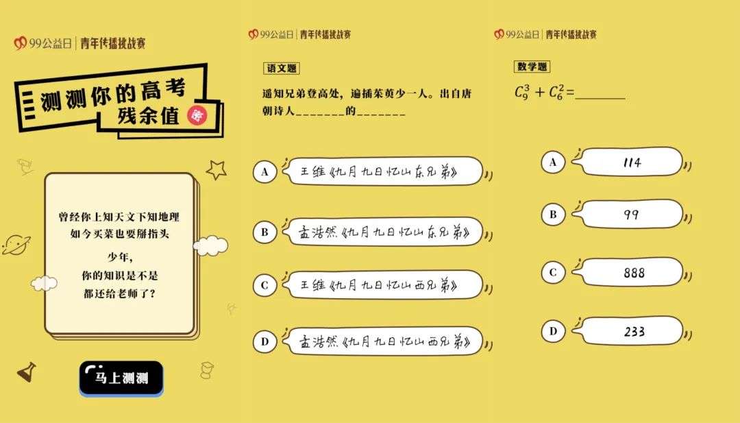 作为高互动式的传播媒介,H5能承载相对丰富的交互形式。2017年,腾讯公益面向大众推出的《测测你的高考残余值》就以测试题的形式向曾经的学霸和学渣们发起挑战。