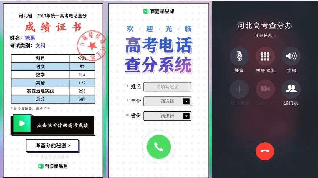 2019年,有道精品课推出了可以查阅分数的H5,不过这个查分仅限娱乐功能,特别的是该H5界面也包含了惟妙惟肖的电话场景、和成绩单等元素,供大众消遣。当然了,用有道精品课H5查到的分数,一定得高分。
