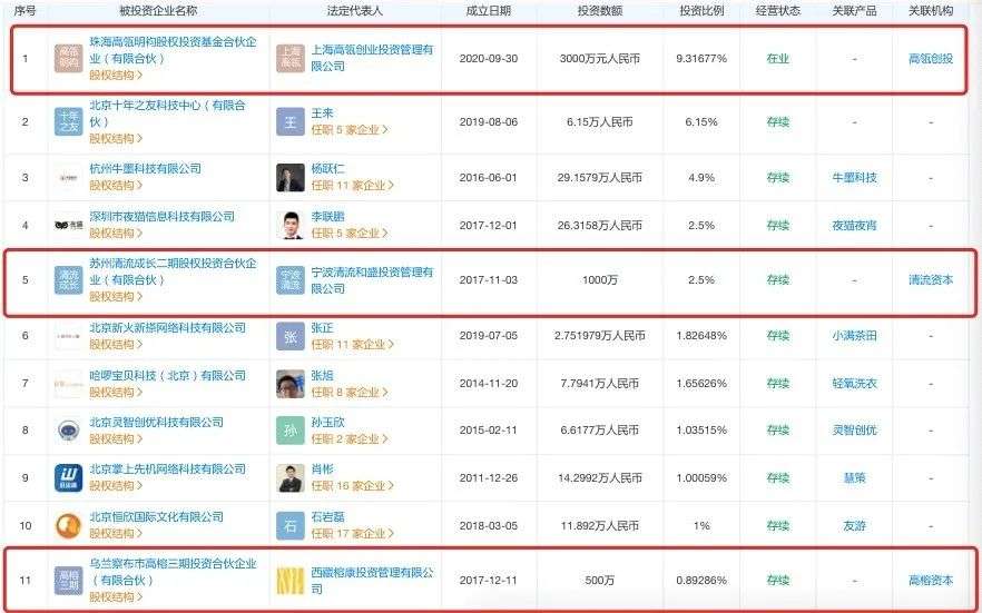 事实上,干嘉伟与高瓴的渊源颇深。除了与高瓴联手多次投资,他还悄悄做起了高瓴的LP。天眼查P显示,在高瓴旗下基金主体——珠海高瓴齐远资产管理中心(有限合伙)中,干嘉伟出资持股7.18%。