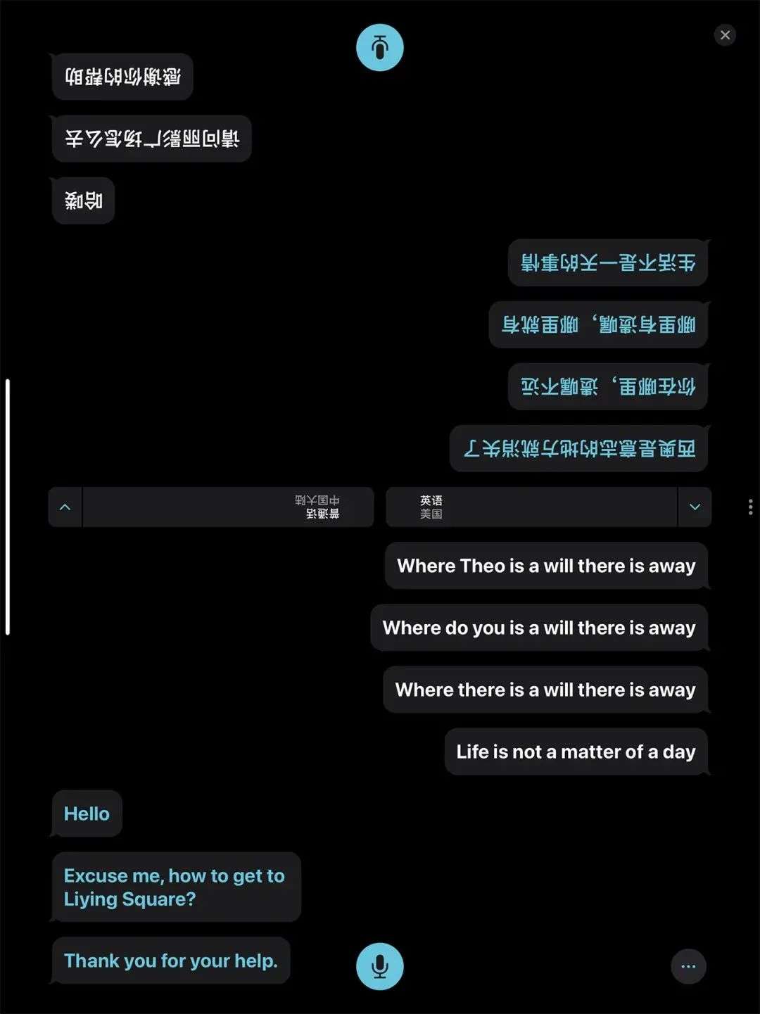 在面对面模式 (face to face) 下,界面是这样的。不过实话实说,翻译功力还带加强,随便试了一句 Where there is a will there is a way (有志者事竟成),在 iPad 上英译中后却是另一番结果。不过对于一般情景式对话,它还是可以做到对答如流的。