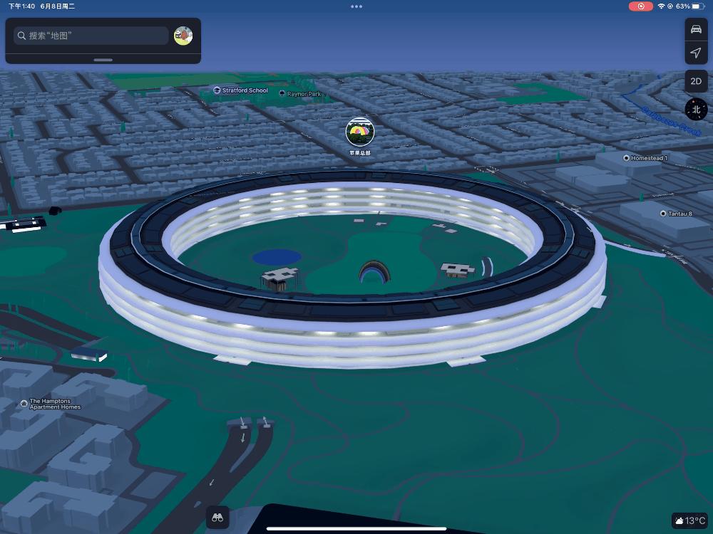 不过当我进入到原版地图时,发现了新大陆。苹果地图对一些著名地标建筑进行了彩色重绘,建立了卡通化模型,在整体呈灰绿色的画面里显得尤为显眼,这样的彩色地标比较少,目前只有旧金山的金门大桥、渔人码头、甲骨文球场及周边著名建筑,另外还有苹果总部的大圆环享受了同等待遇。
