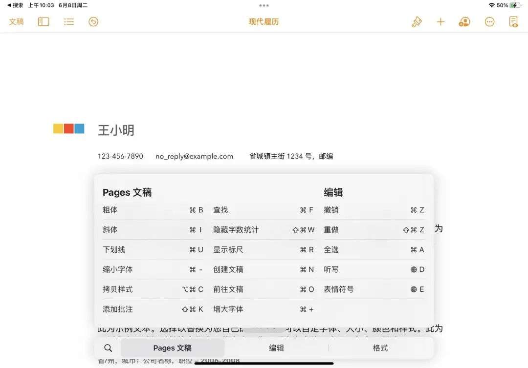 长按 iPad 外接键盘上的 Command 键,会显示出新版的快捷方式键谱,还在原有的基础上新增了一些快捷方式,此时 2000 大洋的妙控键盘变得更有性价比了。
