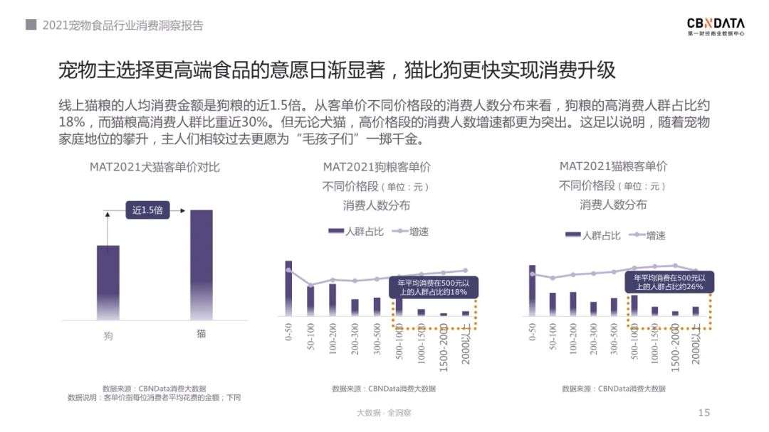 无论犬猫,高价格段的消费人数增速都更为突出,印证了宠物家庭地位的上升,其中喵星人率先实现了消费升级,线上猫粮的人均消费金额是狗粮的近1.5倍。