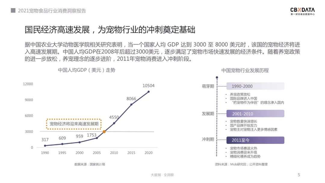 从经济条件看,中国人均GDP在2008年后超过3000美元,满足了宠物市场高速发展的物质基础;