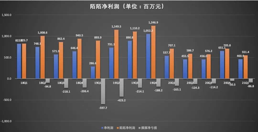 2021年一季度,陌陌主App的净利润为5.51亿元(约1亿美元),较上年同期的7.07亿元,减少22%,较上一季度的7.06亿元,减少21.9%,陌陌主App净利润连续五个季度下滑。