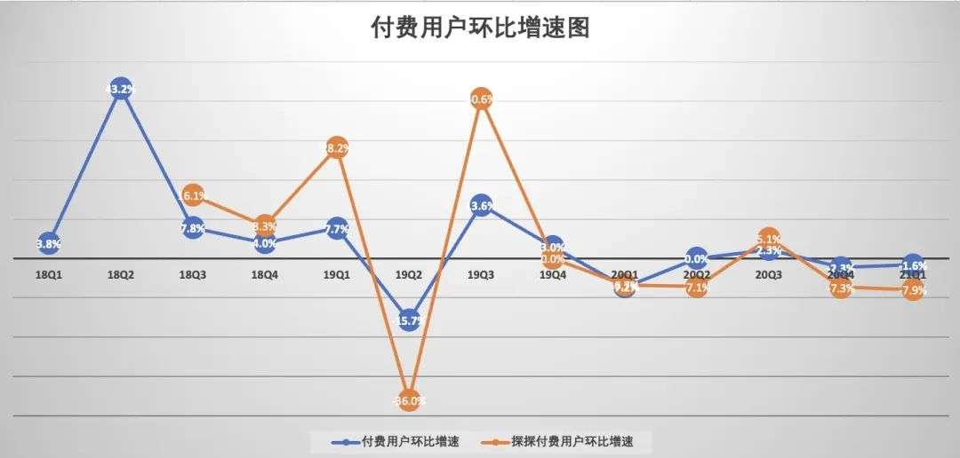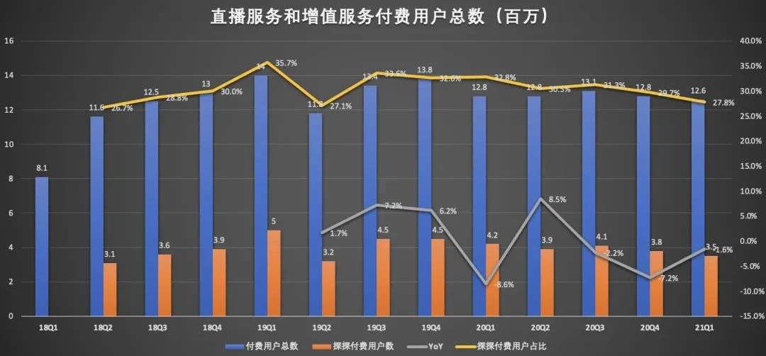 这里值得一提的是,2020年的四个季度中,直播服务与增值服务付费用户有三个季度是处于流失状态,仅二季度实现了同比8.5%的增速。