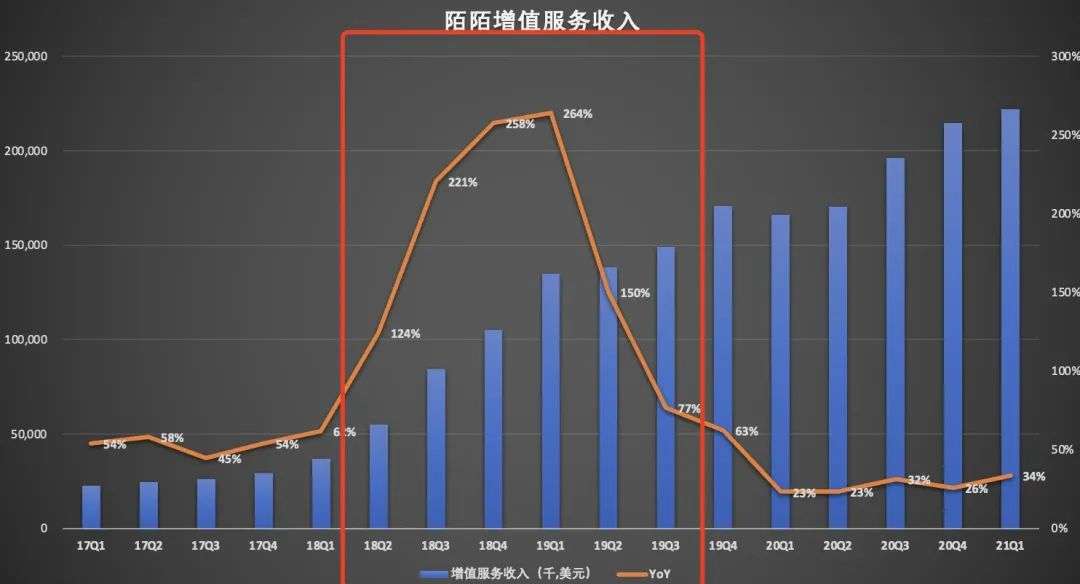 从上图可以清晰的看出,在收购探探之前,陌陌的增速服务收入,年度同比增速保持在两位数的增长,而收购探探之后的两年时间里,增值服务收入均保持了3位数的增长。