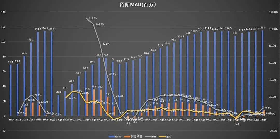财报显示,2021年3月,陌陌主App月活用户(MAU)为1.153亿,较上年同期的1.08亿,净增730万,创历史新高。