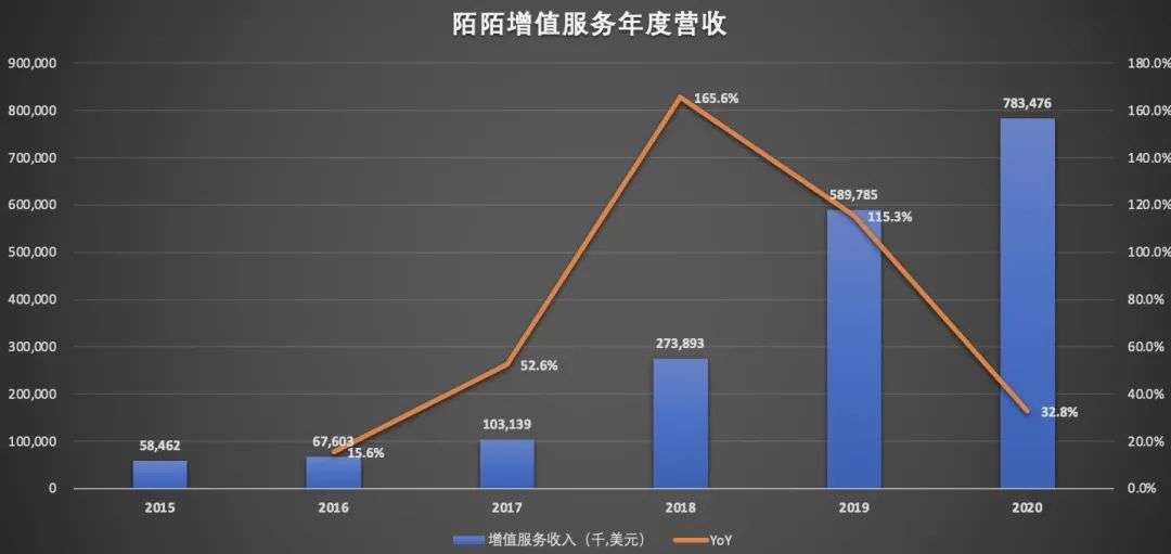 探探上线视频是在2020年,也就说在2020年以前,探探的主要收入来源还是增值服务收入。财报数据显示,2018年,陌陌的增值服务收入为2.74亿美元,同比增长了166%,远超2017年度53%的同比增速。