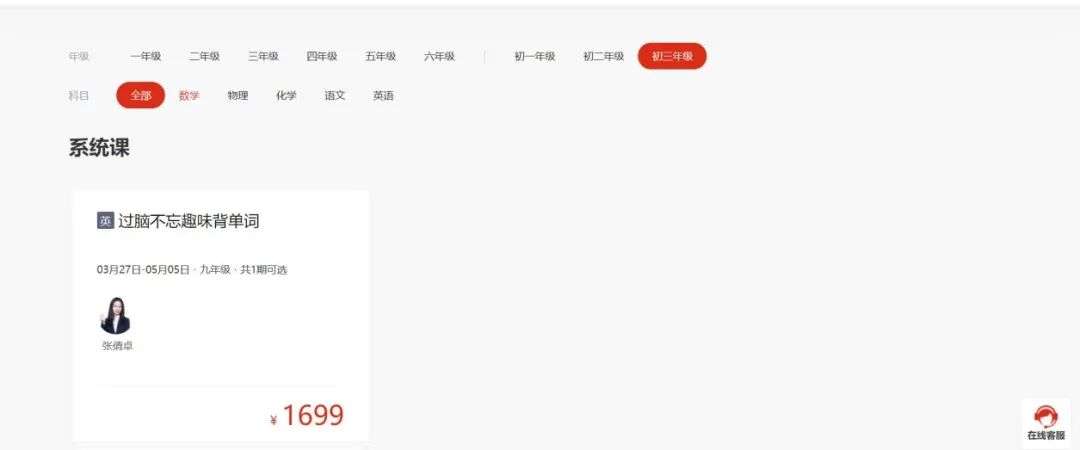 《财经故事荟》打开大米网校官网,目前在售的只有一门针对初三的单词课。