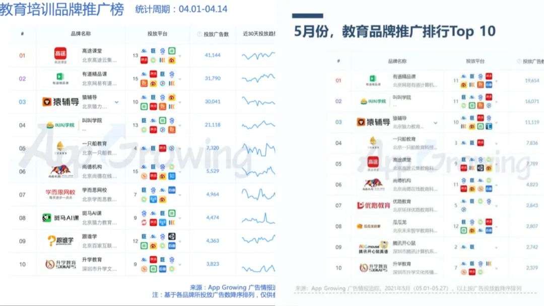 其中,高途课堂在四月上旬原本排行第一的广告投放量,骤然下降至五月份的第五。
