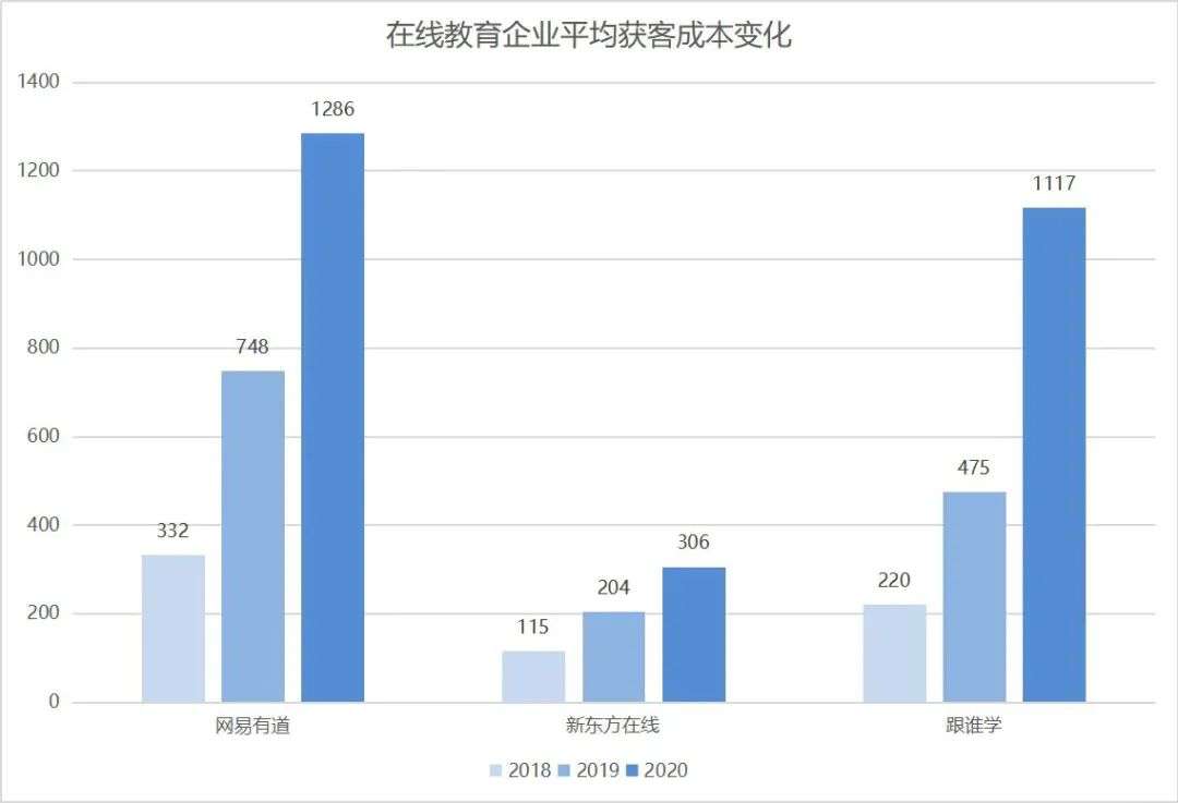事实上,从在线教育企业财报中也可以一窥究竟,2017年,网易有道的在线课程人均获客成本仅为332元,到了2020年就提高到了1286元;高途的在线教育课程也由2017年人均获客成本220元提高到了1117元。