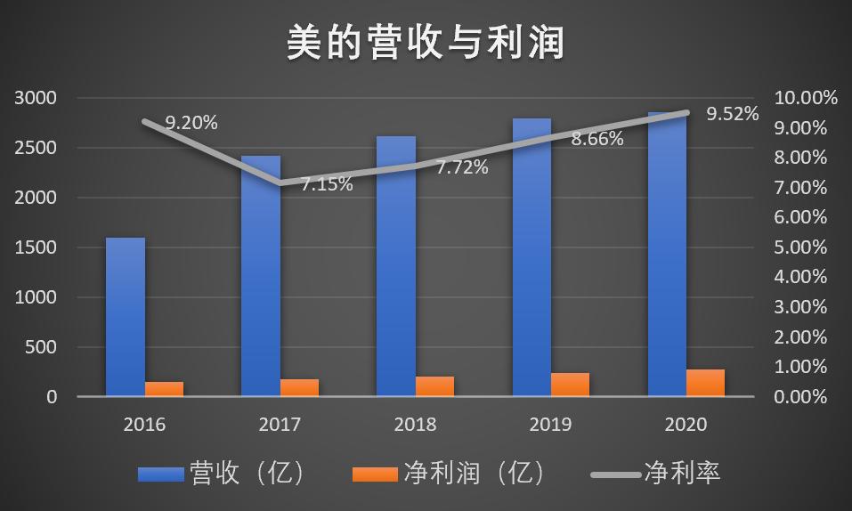 而股价涨跌的直接原因就是现阶段业绩的好坏和预期业绩的高低。从下图近几年美的、格力营收和利润来看,确实很容易解释,就是因为格力自2018年以来业绩滞胀,而美的稳定增长,迎来戴维斯双击。