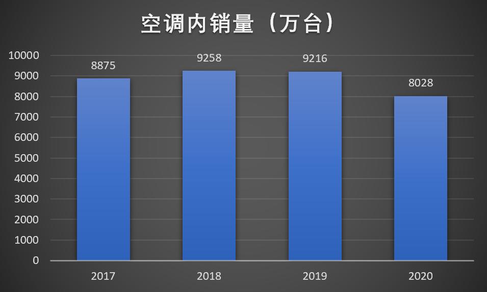 首先, 2017年空调行业受房地产拉动叠加高温天气等因素影响,国内销售量爆发式增长,达到8875万台,到2019年,受累于天气冷年和房地产市场景气度下降,空调市场未创新高。而根据产业在线数据,2020年疫情影响之下,空调内销8028万台,同比下降12.9%。与内销相对应的,2020年空调外销出口达到6118万台,同比增长4.7%,常年稳定增长。