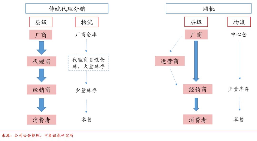 要注意,美的的这一转变是分区域、分品类逐步推进的。小家电已经基本实现全面网批,取消了代理商层级,而大家电尤其是空调,因为淡旺季波动大仍需代理商承担部分压货需求,所以网批规模还偏小,调研时美的透露大概百亿级别,但其持续扩大之势难以抗拒。