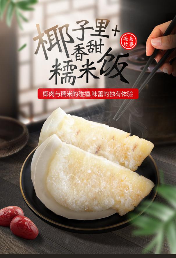 另一方便之处,如果用碗具装糯米饭,事后往往需要热水清洗,因为糯米会黏在碗上面,不容易洗净。而椰子糯米饭,直接用椰子皮盛放糯米饭,免去了洗盛放器皿的活。所以这款可以微波加热的椰子糯米饭,让人既享受了地方美食,也免除了许多准备和清洗的工作。