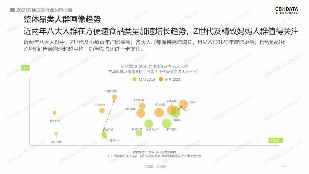 近年来,尤其是在疫情的影响下,方便速食迎来稳定增长。根据第一财经商业数据中心发布的《2021方便速食行业洞察报告》所做的人群画像分析,方便速食的消费人群主要可以分为Z世代、新锐白领、资深中产、都市银发、精致妈妈、小镇中老年、都市蓝领、小镇青年这八大消费群体。Z世代和小镇青年是近两年里,占比最高的两大方便速食消费群体。
