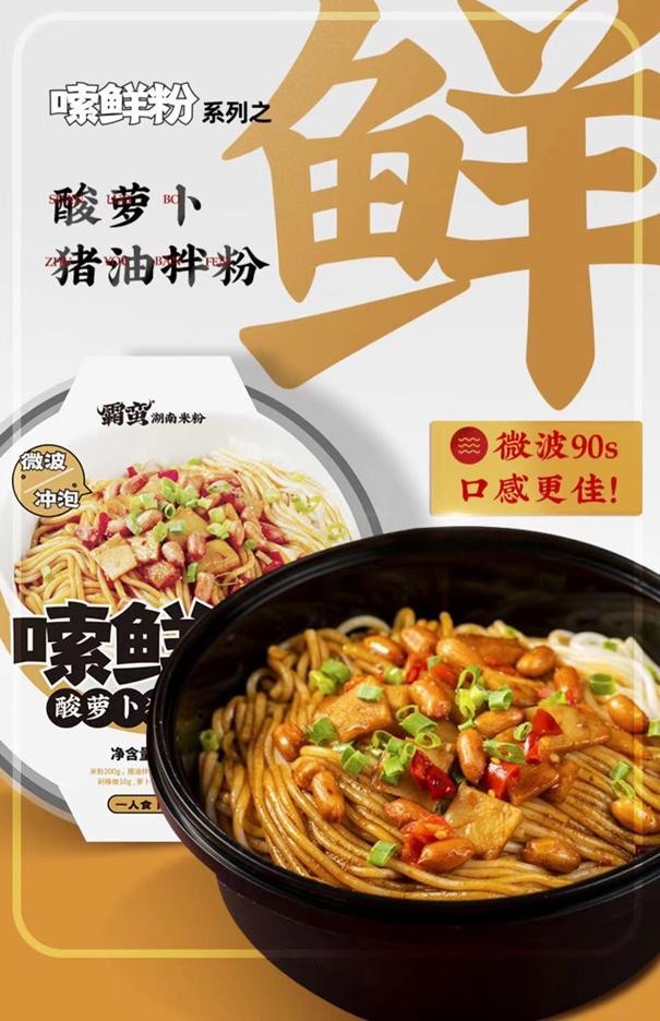 霸蛮米粉旗下多数产品都是需要煮食的常德米粉。其子品牌嗦鲜粉,却是可以采用开水冲泡,或微波90秒的速食米粉产品。这两种吃法,适合追求美味,又不想动手的御宅一族。只是产品目前口味只有一种,为酸萝卜猪油拌粉。