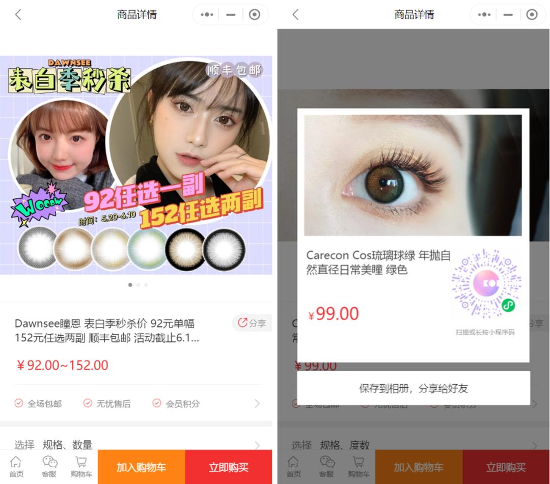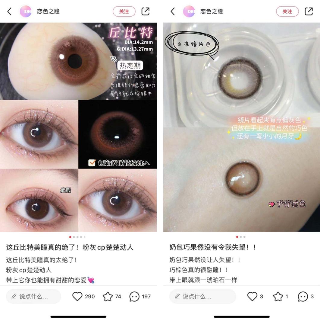除此之外,由于美瞳产品小而精致,这样一种靠视觉冲击力吸引消费者购买的商品,放在线下并不易于展示,而通过新媒体“图文”+视频+直播的形式,则能最大程度地将产品卖点展现。
