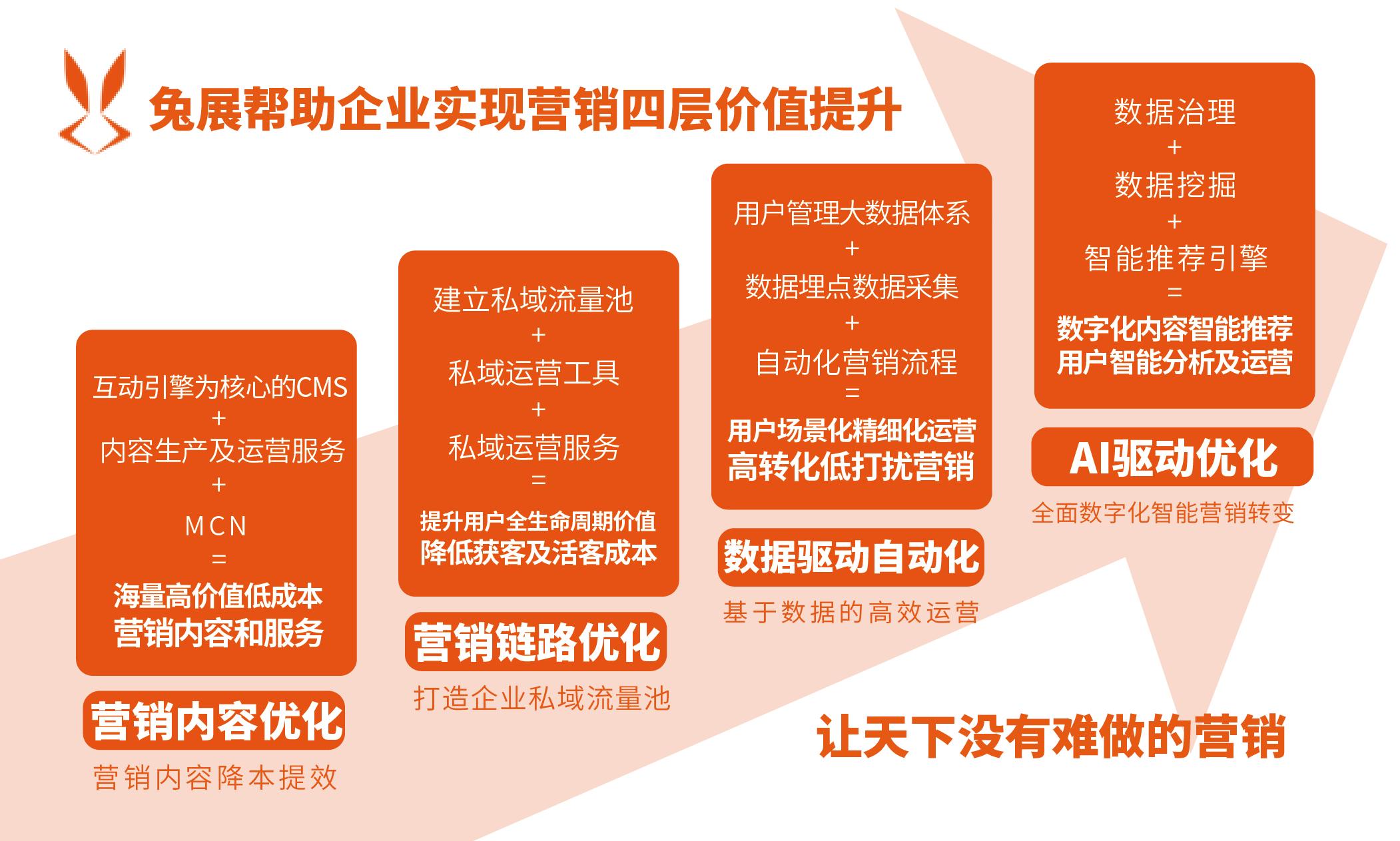 4、AI驱动优化:依托兔展专业的数据治理和数据挖掘团队,以智能推荐引擎,兔展可以提供包括基于用户旅程的智能分析及运营管理、基于内容制作的数字化内容智能推荐及互动以及智能员工管理方面的AI智能营销优化方案。