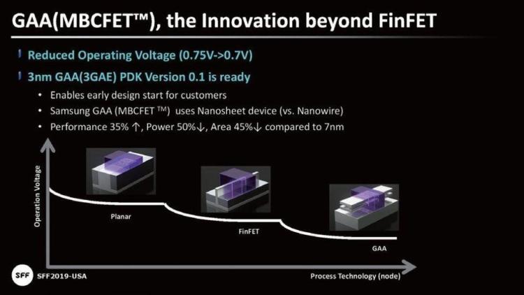 但是到了3nm阶段,FinFET的三面栅的控制作用减弱,短沟道效应再次凸显。直到下一世代的晶体管结构即所谓Gate-All-Around环绕式栅极技术(简称为GAA结构)出现,问题才得以缓解。它可以简单理解为沟道被栅极四面包裹,从而降低操作电压、减少漏电,降低芯片运算功耗与操作温度,从而继续为摩尔定律续命。如今三星的3nm和台积电的2nm都已采用该技术进行研发。