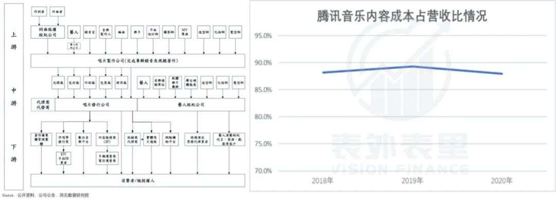 音乐行业传统生产机制下,“词曲作者---词曲版权经纪公司---唱片制作公司---唱片发行公司---艺人经纪公司---音乐平台(等)---消费者”等诸多中间环节,是导致版权内容高企的重要原因。