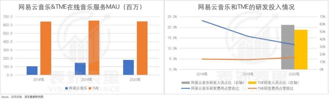 备注:左图中,TME用户规模触顶,数据开始逐渐上升;而网易云2020年数据上升,主要由于和华纳、环球达成版权合作的支出造成。