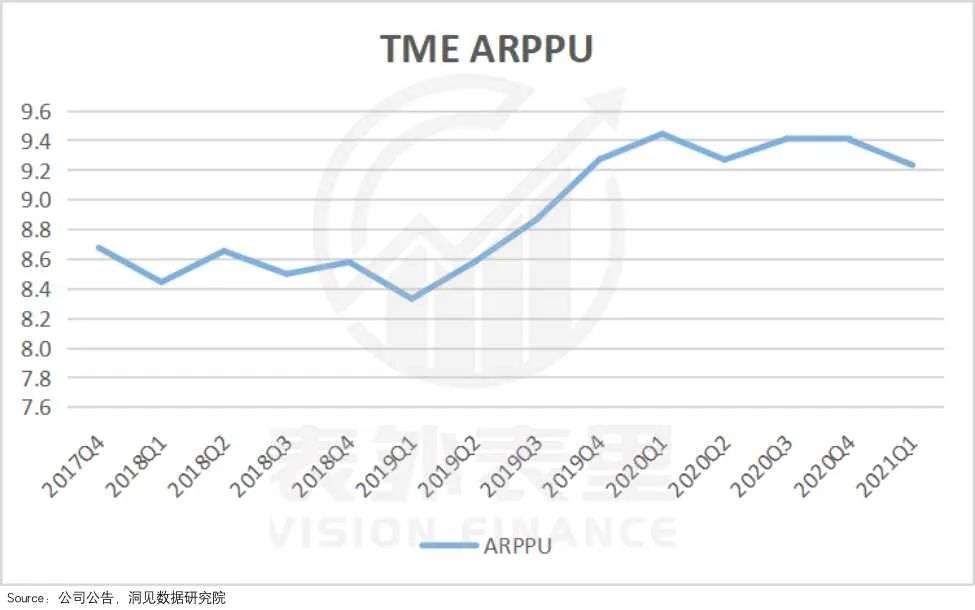 可以看到,凭借内容版权优势,建立付费墙,从2019Q2开始,腾讯音乐的ARPPU(每付费用户每月收入)持续上涨,最终稳定在9以上。营收整体进入提价增收阶段。