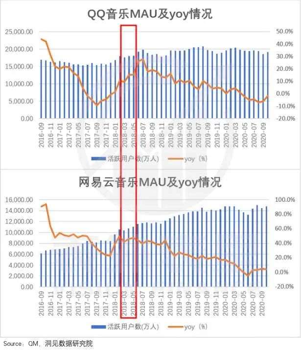 如下图,此事件后的一段时间内,网易云音乐活跃用户增速的上涨势头被遏制;与之相反,当时独家拥有周杰伦版权的QQ音乐,月活用户同比增速则实现跳涨。