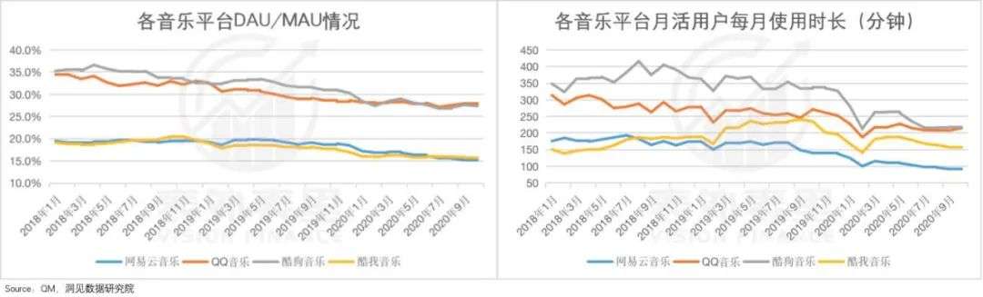 如下图,2018年1月-2020年9月,在用户留存方面,网易云和酷狗始终位于第二梯队,最后还被酷狗赶超;而月活用户每月使用时长数据显示,网易云从2018年年中开始,一直是最低的。
