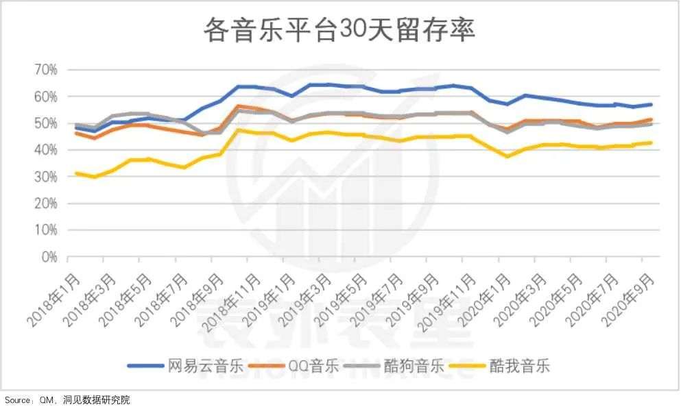 数据显示,在30天留存率(简单理解就是用户下载APP以后,30天内不卸载)上,网易云音乐的确高于其他音乐平台。