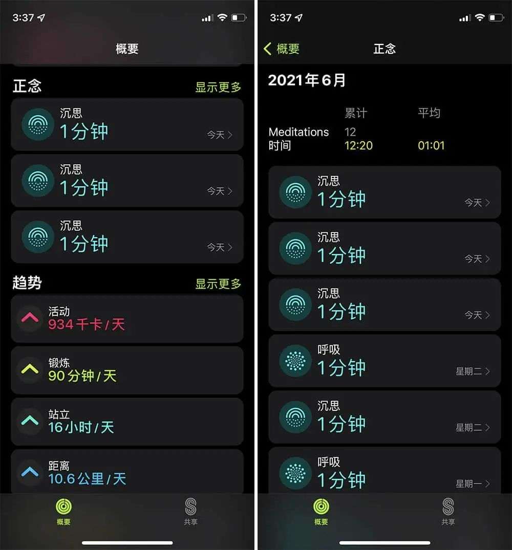 同时,iPhone 上的《健身》app 也加入了「正念」栏目,在这里会记录你的所有呼吸信息。